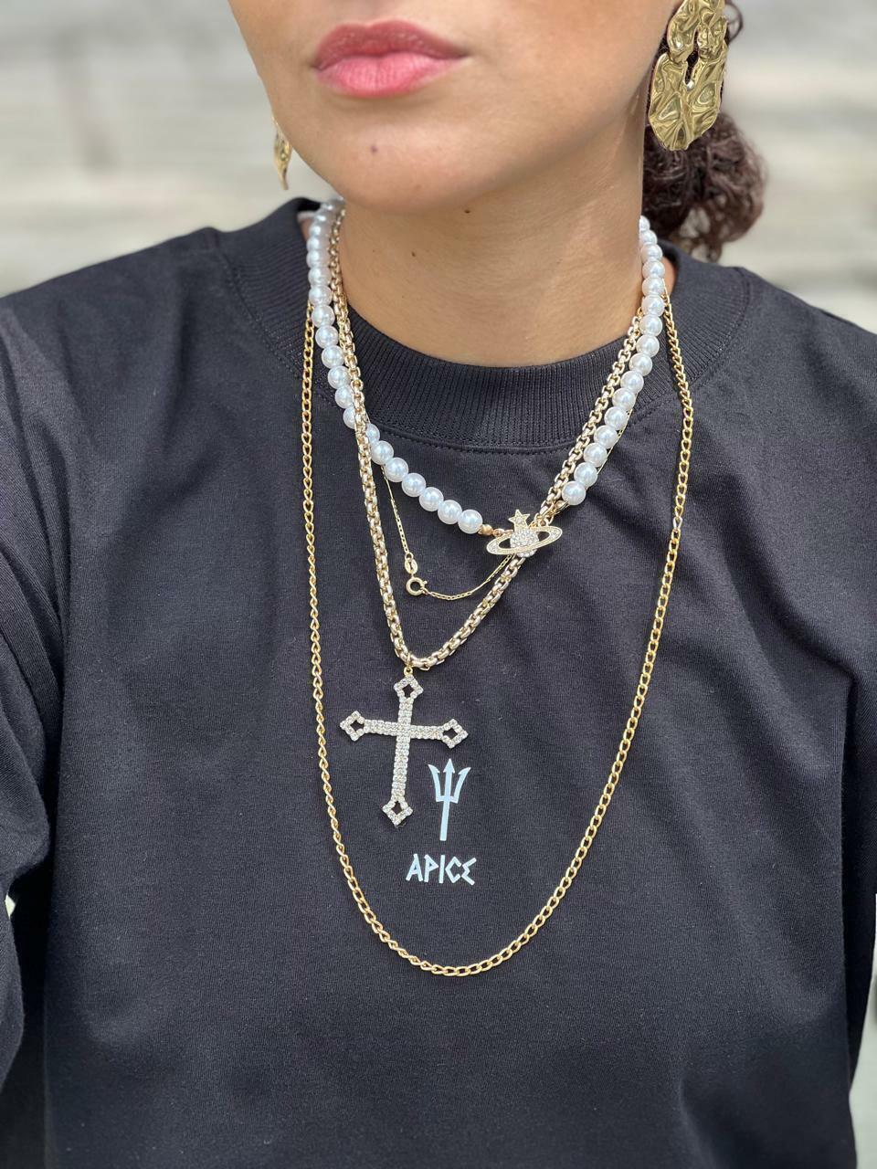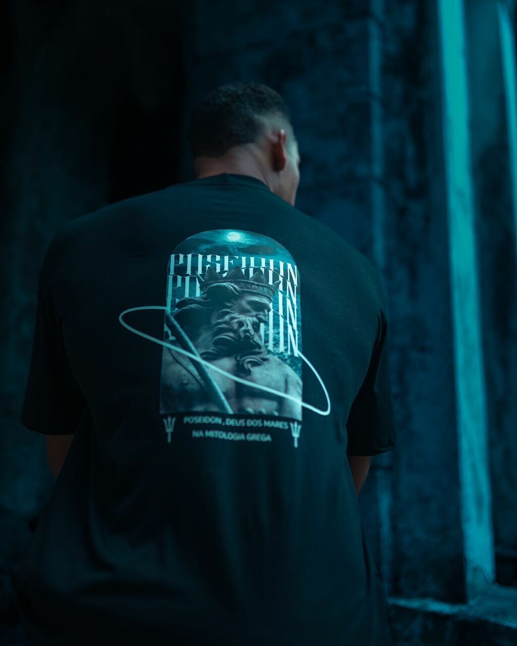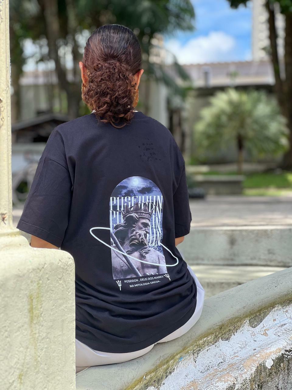 Camisa oversized preta, que remete ao deus do mar.